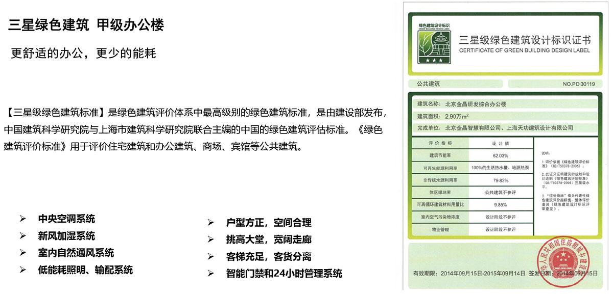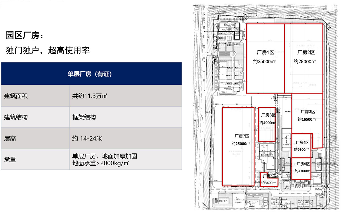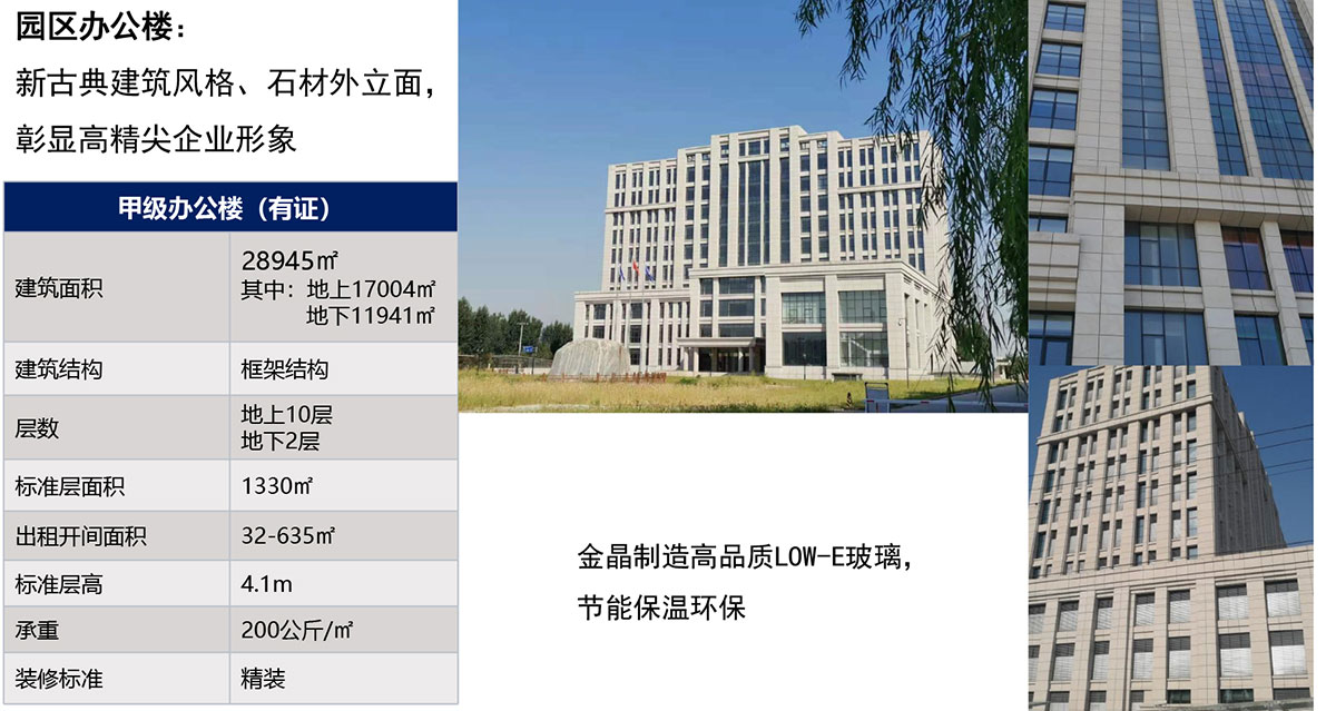 建筑现状:绿色建筑三星级甲级办公楼,总面积29000平方米,地上面10层,地下2层,配套车位200个 厂房5座,地上建筑面积13.5万平方米,层高14-24米。