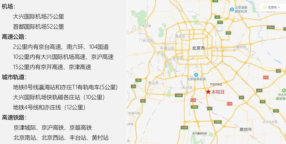 位于南六环南侧,北京大兴新城、亦庄开发区、北京大兴国际机场空港区核心腹地,交通便捷优势突出,区位优越,交通便利。